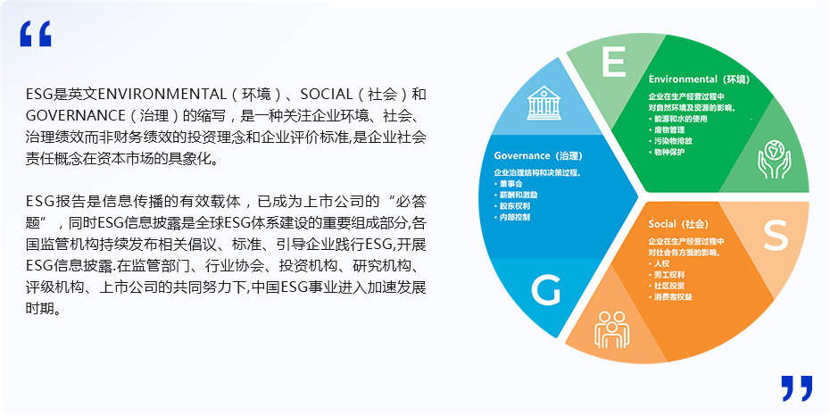 ESG是一种关注企业环境、社会、治理绩效而非财务绩效的投资理念和企业评价标准,是企业社会责任概念在资本市场的具象化。