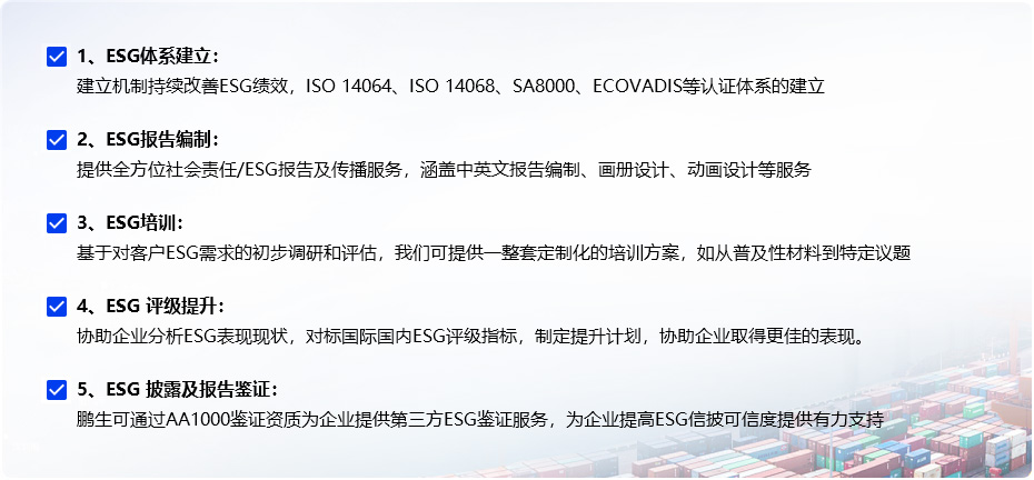 鹏生可为企业提供ESG体系建设辅导、ESG报告编制服务,为企业开展ESG培训课程